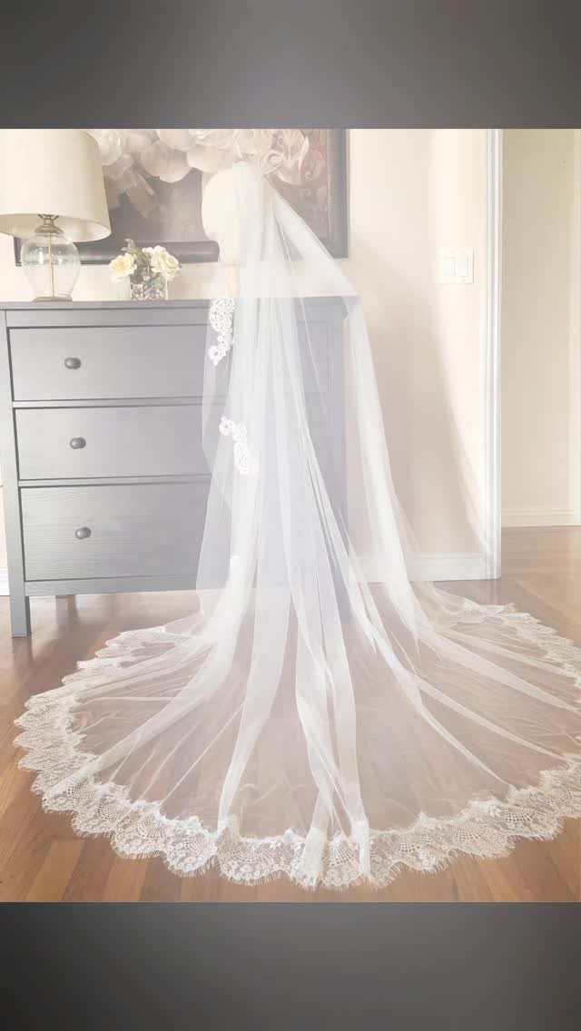 Our chapel veil is approximately 90’’ long. This veil is a great choice, because it drapes on the dress complementing the details of their wedding gown.